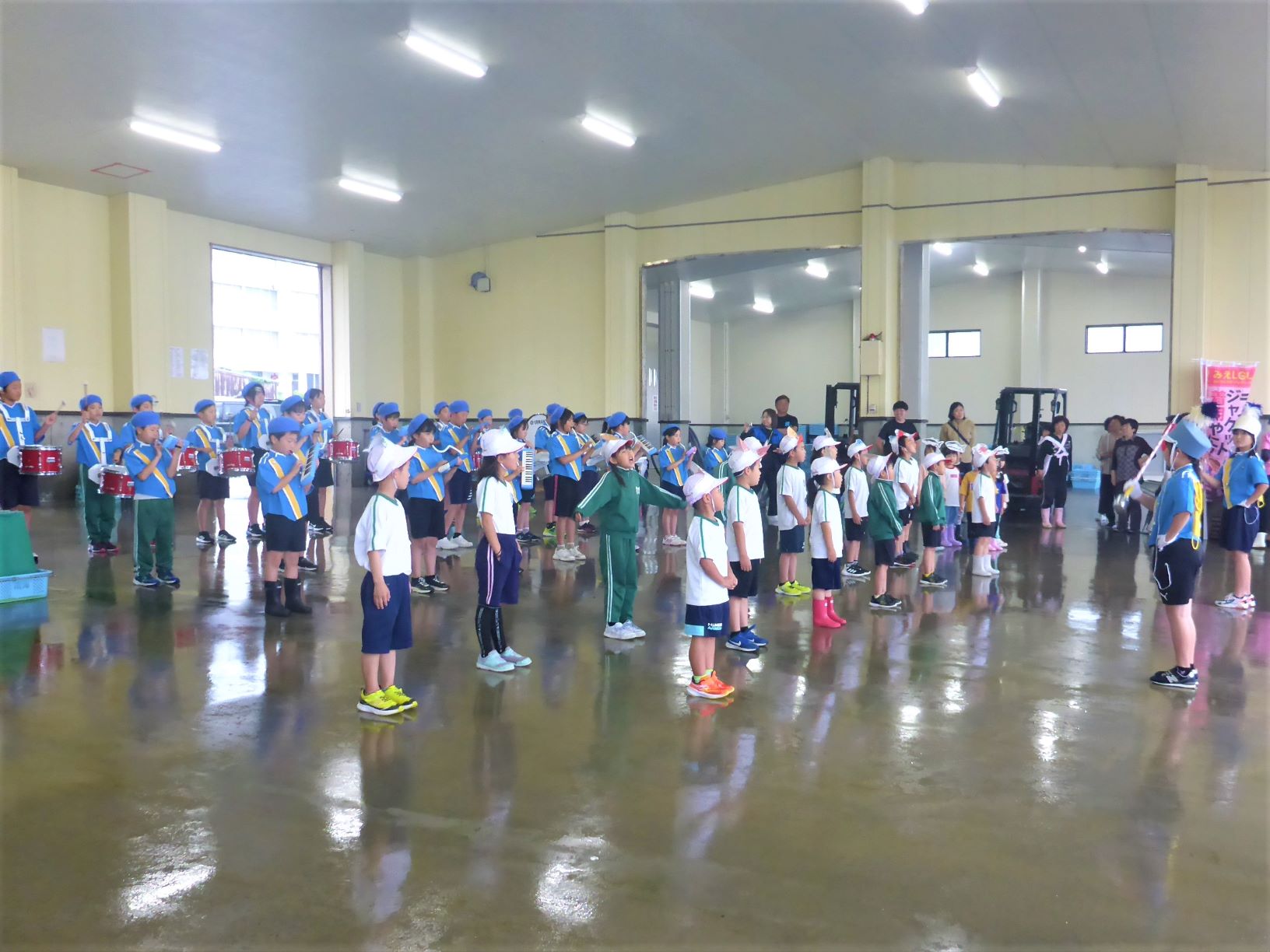 答志魚市場で児童の皆さんによる鼓笛隊の演奏が披露され、続いて岸壁からヒラメ稚魚を放流しました!