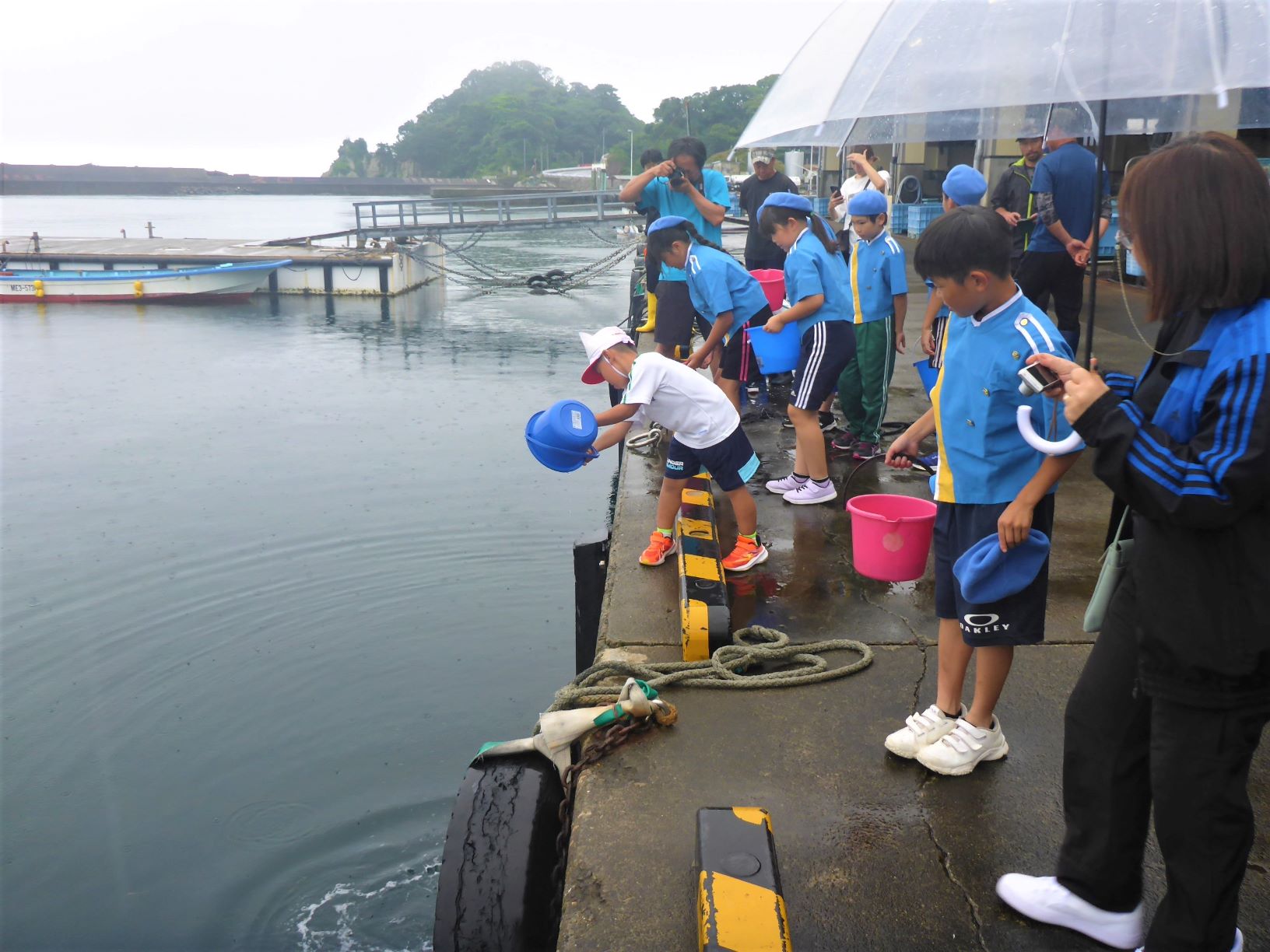 令和7年6月10日に鳥羽市答志町地元小学生の皆さん、地元保育所の皆さんと「第45回大会記念リレー放流」を行いました!