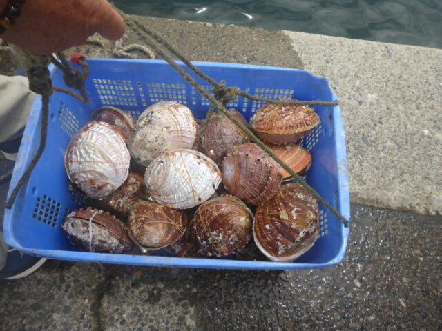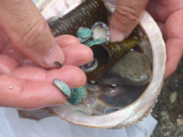 大きなアワビの殻で包み込んだアワビ稚貝を、豊漁と海の安全を祈願し放流してくれました。