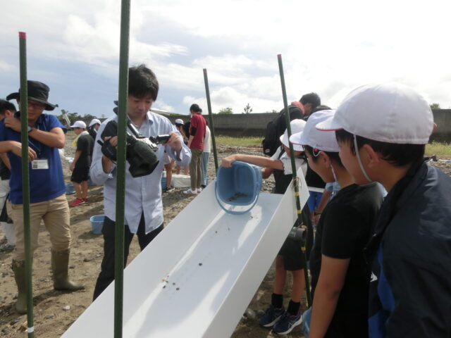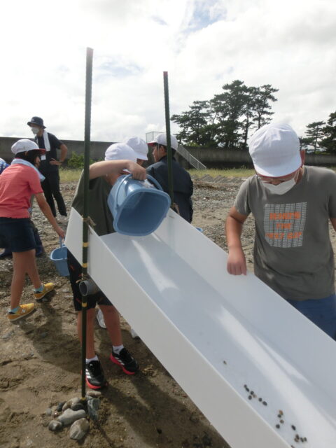 生徒の皆さんもアサリやクルマエビに興味津々で、元気いっぱいに放流をしてくれました!