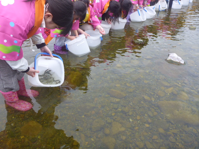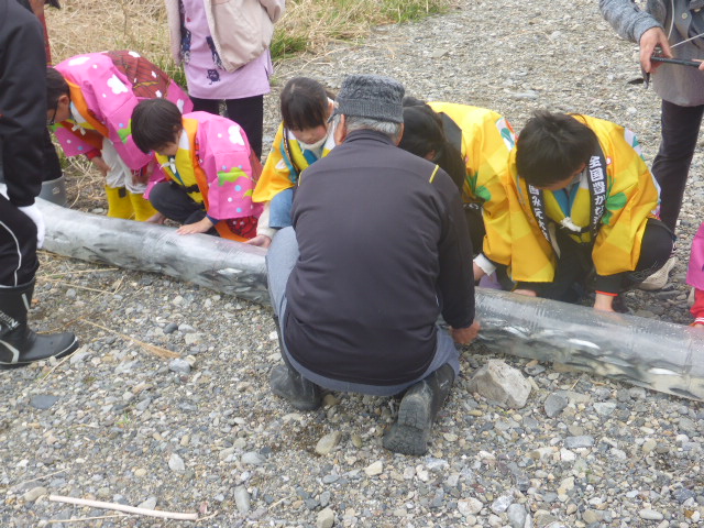 漁協さんが毎年行っているホースから放流する様子を見学した後に、子供たちがバケツで放流を行いました。