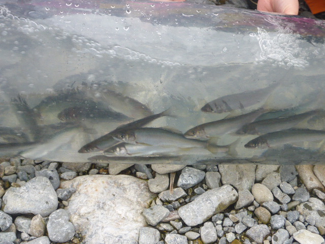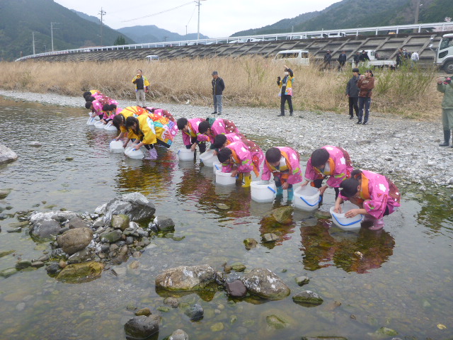 今回は大内山川でアユの稚魚を放流しました。