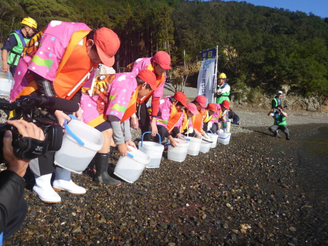 令和6年11月25日に公益社団法人日本釣振興会三重支部、大紀町立錦小学校の皆さんと「第30回大会記念リレー放流」を行いました!