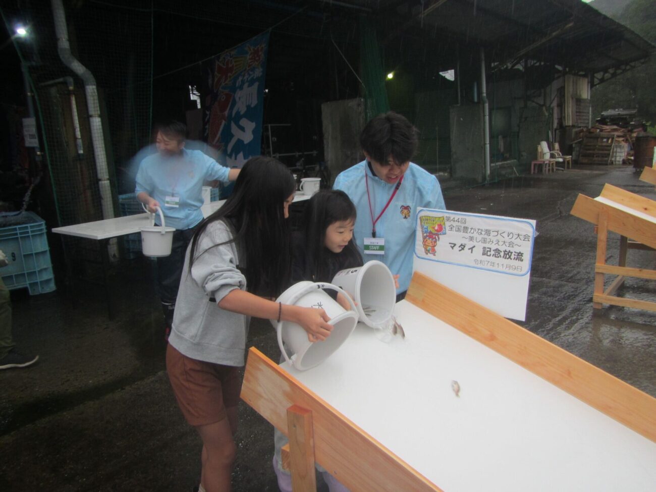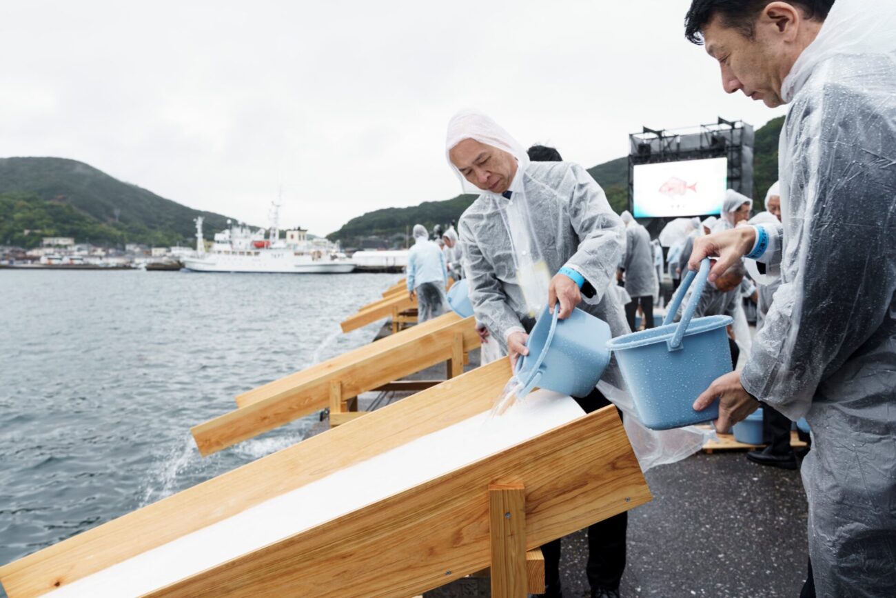 志摩市の志摩市阿児アリーナでは式典行事を、南伊勢町の宿田曽漁港では海上歓迎・放流行事が執り行われました。また、県内5ヵ所(桑名市桑名港、津市白塚漁港、志摩市ともやま公園、南伊勢町奈屋浦漁港、尾鷲市尾鷲魚市場)の関連行事会場には、大会の模様が映像で中継され、全体で13,000人以上と雨天にもかかわらず多くの皆様にご来場いただきました。
