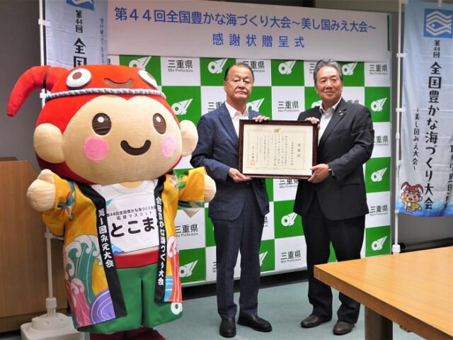 令和7年9月25日(水)に、三重県庁3階プレゼンテーションルームにおいて、イオンリテール株式会社様、尾鷲物産株式会社様、岡三証券株式会社様による「第44回全国豊かな海づくり大会~美し国みえ大会~」への協賛に対する感謝状贈呈式を行いました。
