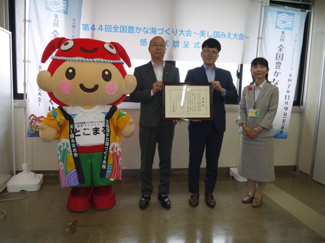 令和7年10月3日(金)に、三重県庁6階農林水産部ミーティングルームにおいて、株式会社養殖屋様並びにゼブラファーム株式会社様による「第44回全国豊かな海づくり大会~美し国みえ大会~」への協賛に対する感謝状贈呈式を行いました。